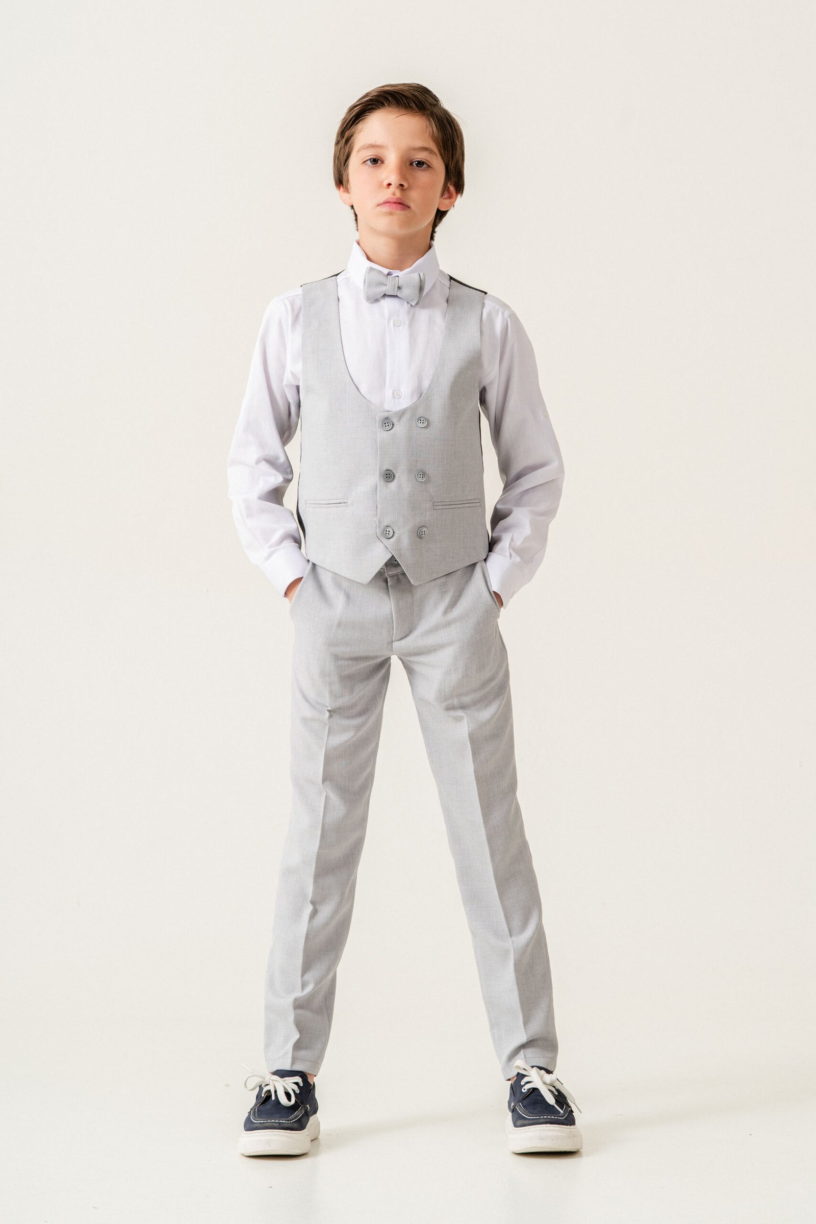 The set includes a tailored blazer, double-breasted vest, classic white shirt, matching trousers, and a bow tie for a complete sophisticated look. Crafted from premium-quality fabric, it ensures comfort, durability, and a sharp modern silhouette.